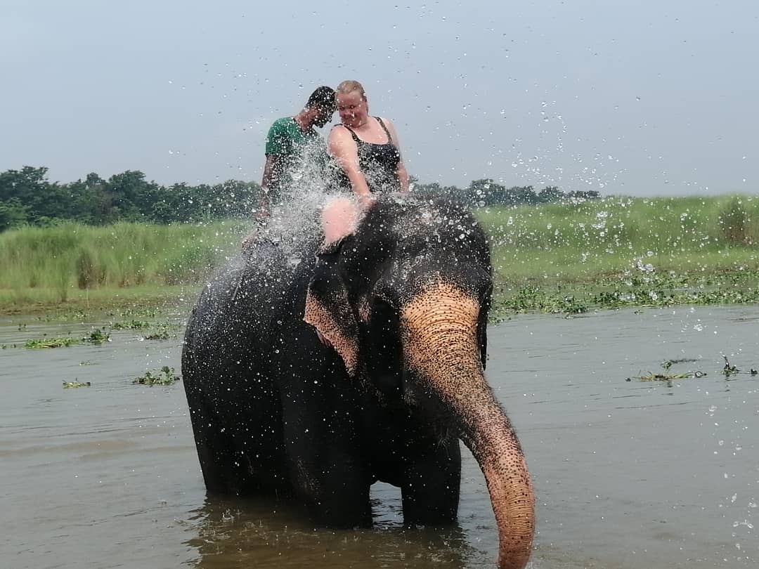 Läksin vette ning sain talle ka selga. Mahol käskis tal mind londist nii külje pealt kui ka otse näkku vett printsida. Elevant tõusis püsti ning jätkas veega lödistamisega. Lõpuks andis mahol talle käskluse mind seljast maha raputada. Ma teadsin, et eks ma vees lõpetan. Meie giid, kes oli ametis minu pildistamisega küsis, kas ma oskan ujuda? Sellega oli asi selge. Vesi ei olnud seal üldse sügav. Ainult kuni rinnuni.