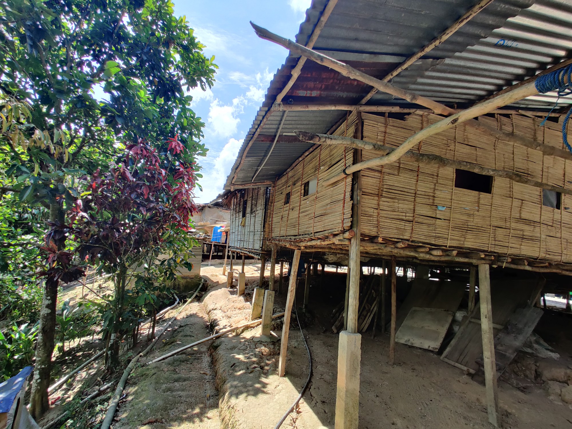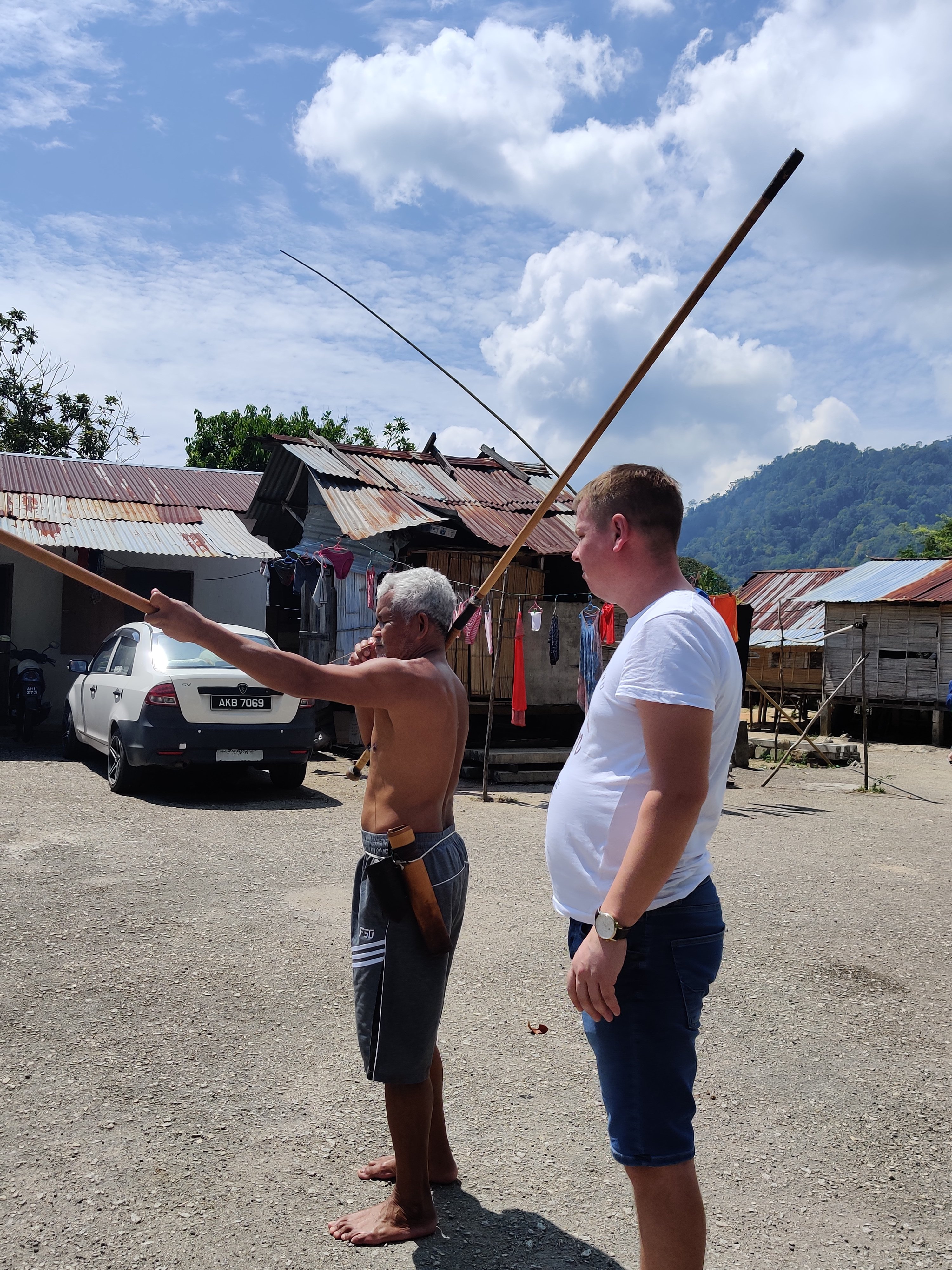 Enne hotelli jõudmist oli meil ka kohaliku küla külastus. Koosnes paarist punutud majast muldpõranda peal ning üks pool paljas külavanem tutvustas meile “blow pipe” puhumist. Väliselt tundus see keeruline ja raske. Kuidas nii pikast torust on võimalik üldse nool välja puhuda? Kui ise proovisin, siis oli see lihtne. Ma suutsin isegi märki tabada. Muidugi ei teinud ma seda pikalt distantsilt ning eks need kohalikud hõimud suudavad sellega liikuvaid märklaudu – loomi, püüda.