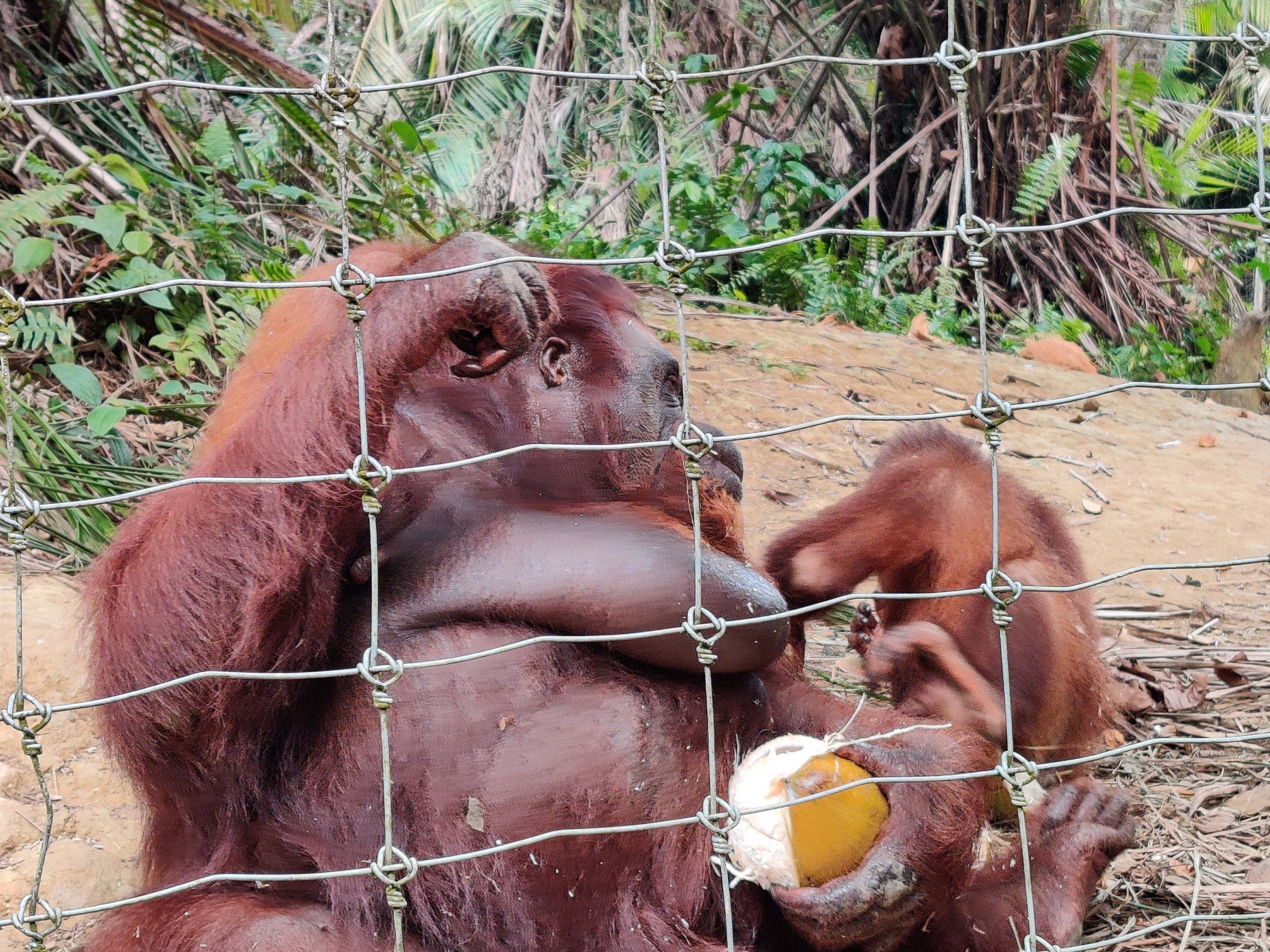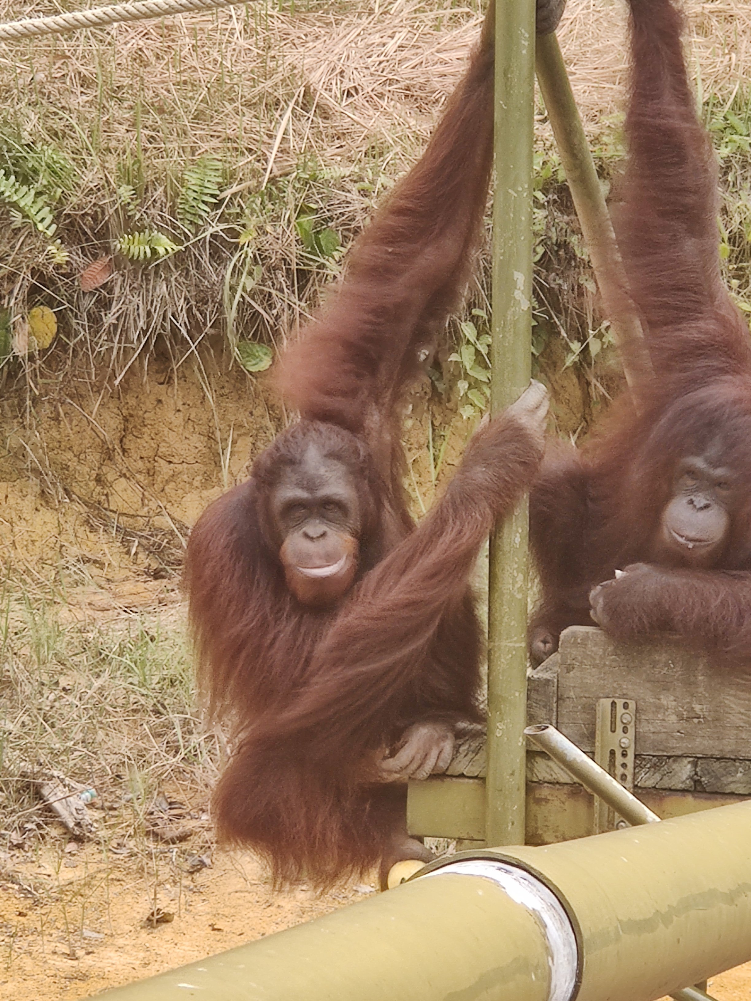 Nende talitaja haaras endaga kaasa kookosed ja nii me orangutane meelitama läksime. Esimeste orangutanide juures oli selline suur toru, mille seest talitaja neile kookoseid veeretas. Edasi minnes oli üks emane koos poegadega. Andsime ka talle kookose. Küll üks väike pärdik noolis seda kookost. Teine väikseke oli nii alandlik ja ootas kurva näoga, et äkki talle ka ikka jätkub.