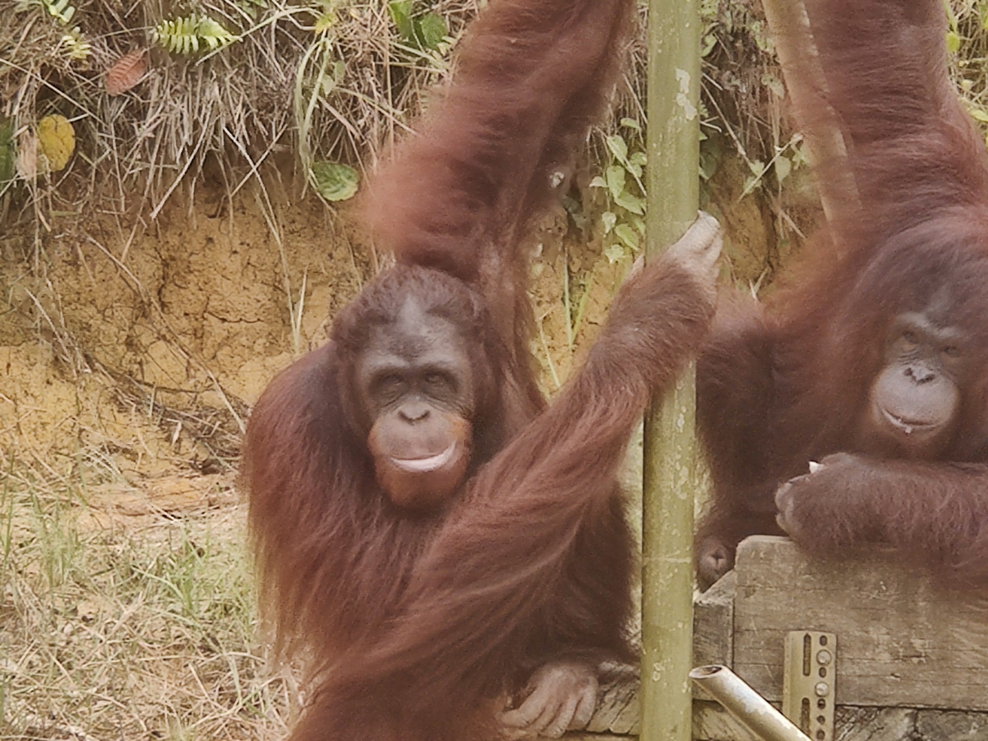 Nende talitaja haaras endaga kaasa kookosed ja nii me orangutane meelitama läksime. Esimeste orangutanide juures oli selline suur toru, mille seest talitaja neile kookoseid veeretas. Edasi minnes oli üks emane koos poegadega. Andsime ka talle kookose. Küll üks väike pärdik noolis seda kookost. Teine väikseke oli nii alandlik ja ootas kurva näoga, et äkki talle ka ikka jätkub.