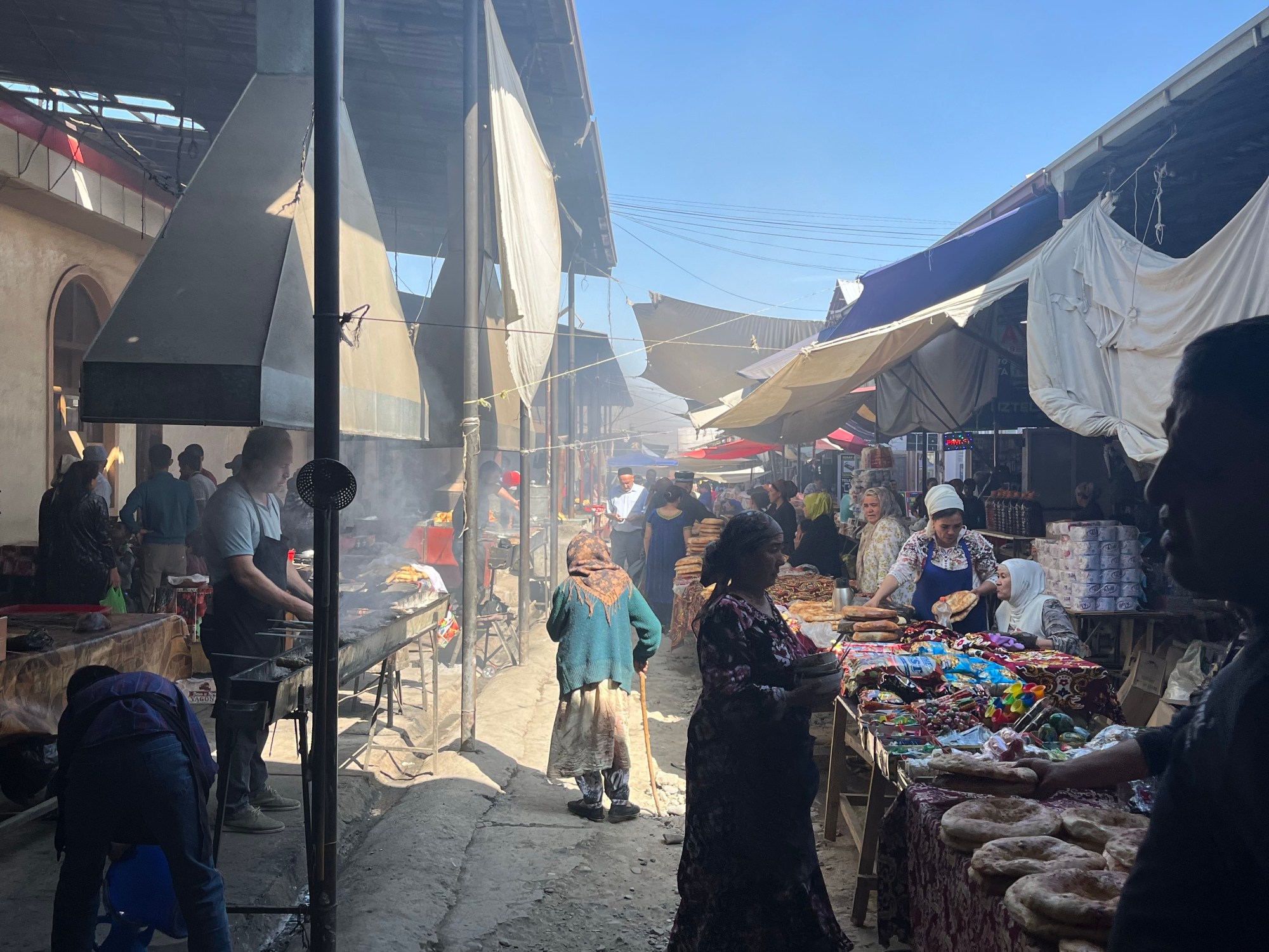 Linnaliinibussist välja astudes ei olnud mul õrna aimugi, kuidas ma Urguti bussi üles leian. Kiirem viis oli üle platsi hüüda kõva häälega URGUT – ja juba tuldi mind kättpidi bussi viima. Bussiga sõitsime ca tund aega Urguti turule. Seal käis juba korralik mäsu. Seda oli näha, et pühapäev oli eriline turu päev. Turu piirid olid laienenud ka tänavale ning palju oli ajutisi lette. Minule kõige huvitavam osa oli söögi osa. Otse tänaval tegid müüjad kebabi ja grilli. Sees olid söögisaalid ning said kohe ka kõhu täis. Mina tellisin kaks kebabi rohke sibulaga ning see oli minu hommikusöök kell 10 hommikul. Suu mõnusalt sibula järgi lõhnamas, alustasin turu avastamisega.