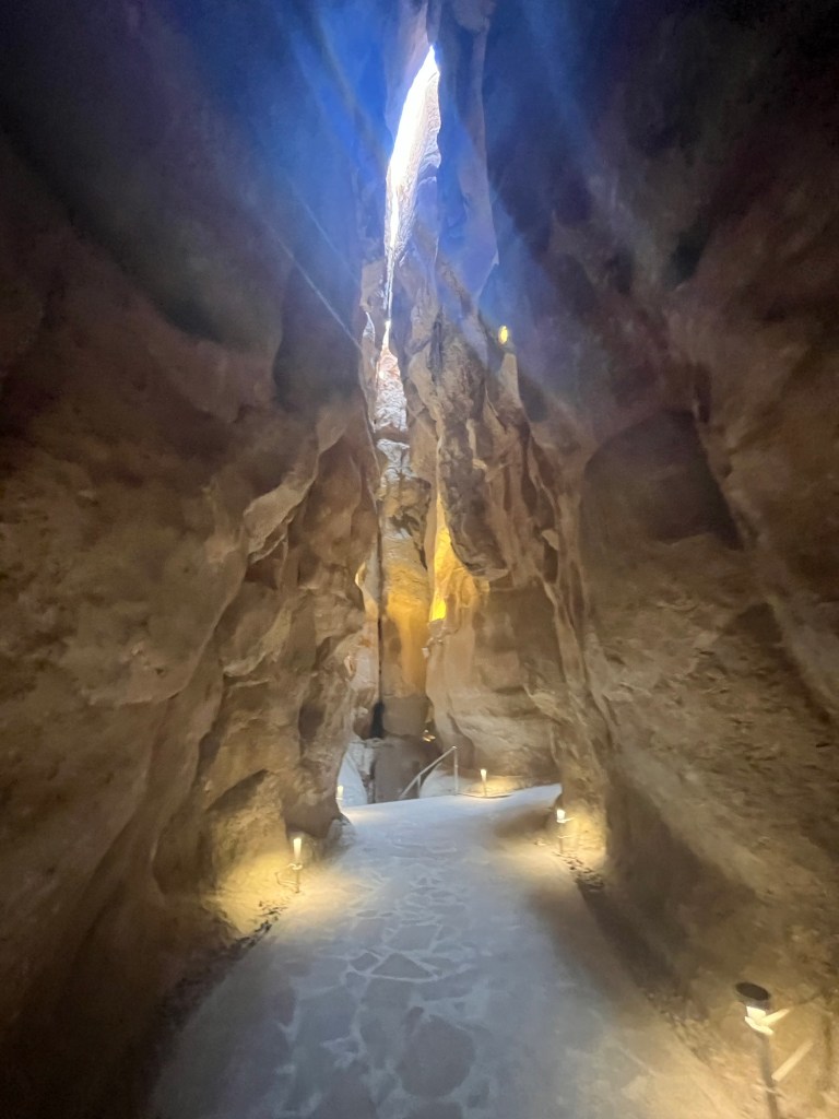Enne Hofufi linna minemist oli plaan käia Al Hofufi kõige huvitavamas kohas – Al Qarah koopas. Inglise keeles on a küll Al Qarah mägi, kuid põhiatraktsioon on koobas oma sirgjooneliste käikudega, mis on sinna tekkinud maavärina tagajärjel. Eelmisel korral sõbrunesin seal ka kohaliku mehega, kes veab projekti, kuidas me kõik oleksime suured õed ja vennad. Saatsin talle whatsappi sõnumi, et me oleme teel. Punt eestlased, kes on juba kõik näljased ning lasin araabia kohvi ja datlid valmis panna. Ta tahtis meile ka teha väikest tuuri oma näitusesaalis, kuid ma ei andnud talle aega. Ma teadsin, et oleme ulmelisel missioonil jõuda ühe päevaga Ida Saudi Araabia läbi sõita. Nautisime datleid, vaatasime suveniire, lasin poisile meile jagada eestikeelsed raamatud islamist ning olimegi juba valmis minema koobast avastama.