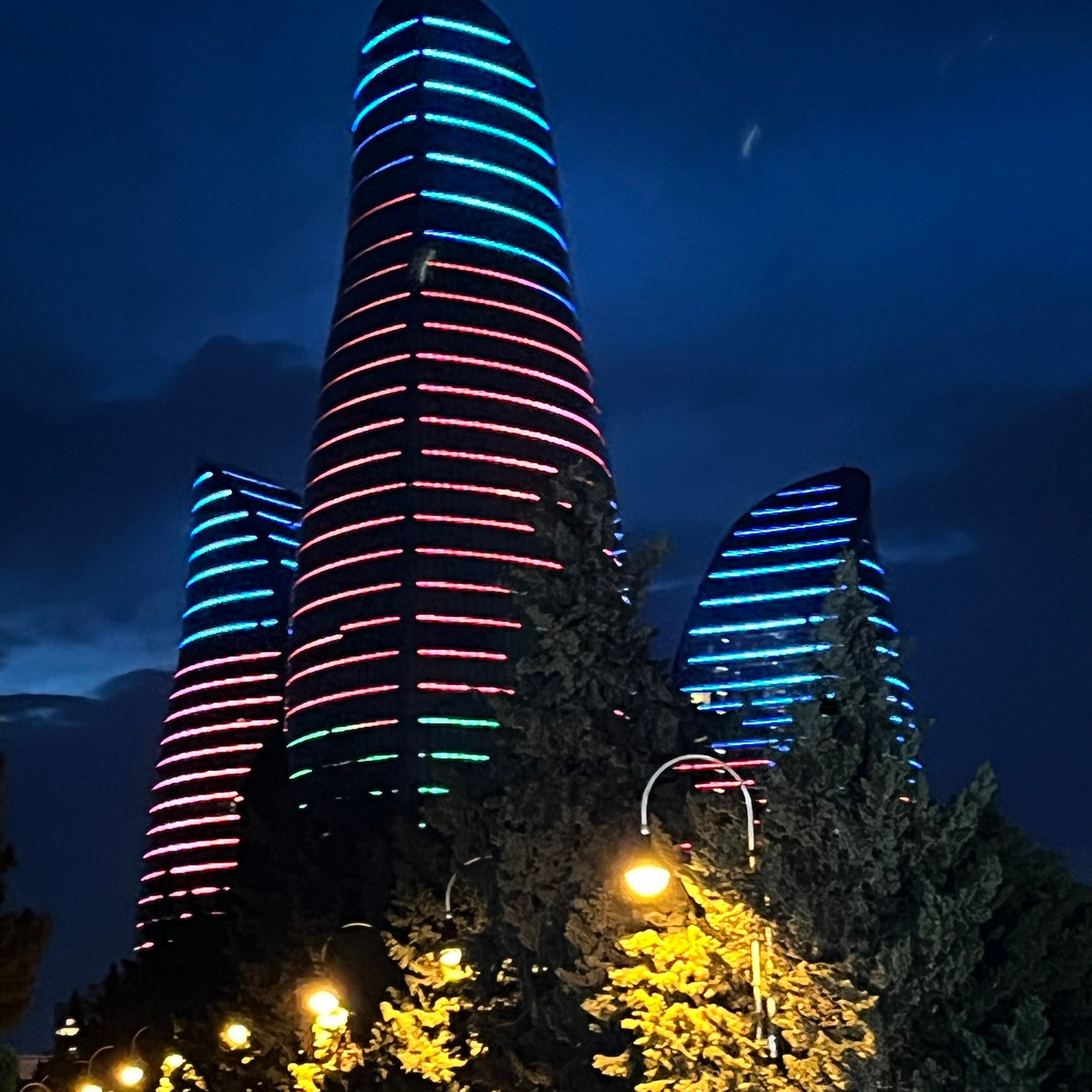 Flame Towers asub linna kõrgemas punktis ning on kontorihoone. Selle modernse tuleleeki meenutava hoone kõrval on “Highland park” – ma ei teagi, kuidas seda eesti keelde tõlkida. Kuna park asub mäe otsas, siis see on väga populaarne koht turistide seas. Pargist avaneb ilus vaade üle Bakuu. Parki saab minna taksoga, bussiga, funikulööriga (esmaspäeviti suletud, muudel päevadel töötab 10-20) või siis nautida lõputut tõusu ja trepiastmeid jala minnes. Mina käisin seal lausa kaks korda. Üks kord hommikul ning teine kord õhtuse ekskursiooniga. Pargi ala jaguneb kaheks. Üks on nö vaateplatvorm ning teine märtrite park, kuid sellest natuke hiljem. Funikulööriga tulin alla. Pean mainima, et seal mingeid erilisi vaateid ei tekkinud, sest puud oli väga kõrged . Vaateplatvormilt saate märgatavalt parema kogemuse. Funikulööri peatuse all üle tee on kohe Bakuu vaibamuuseum ja “Väike Veneetsia”. Vaibamuuseum oli äge, kuid “Väike Veneetsia” pettumus. Selline pisike kompleks kanalitega, kus saab gondliga sõita ning kompleksis on paar Itaalia restorani. Nii vaibamuuseum kui ka “Väike Veneetsia” asuvad Bakuu promenaadil.