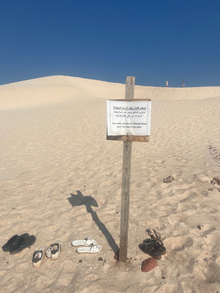 Aheri rannas soovisime panna oma riideid kuivama. Kohe kui meie autojuhid nägid, millega üks turist end piinab, ajasid nad kaks autot üksteise kõrvale nii, et nad said meile kaks pesunööri sinna vahele tõmmata. Nii me käisime aegajalt oma ujumisriideid seal kuivatamas. Kui me Al Hoq koopast ära sõitsime peale lõunapeatust, siis mul läks teatud info kõrvust mööda. Tegelikult ütles meie giid, et me peatume korraks Aheri rannas, et telgid maha panna ja telkimisplats ära broneerida ja siis liigume edasi krabiranda. Detailid, detailid. Kui autod rannas peatusid hüppasime meie sõbrannaga korraks autost välja, et rätiku all tirkoo selga panna. Olime mõlemad saanud aluspüksid jalast kui juht autosse tagasi istus ning sõit jätkus. Nii me istusime seal autos palja tagumikuga ning kihistasime naerda. Sõitsime krabiranda ning seal liivarannas merekohina saatel rätikute all saime oma riietevahetuse edukalt lõpetada.